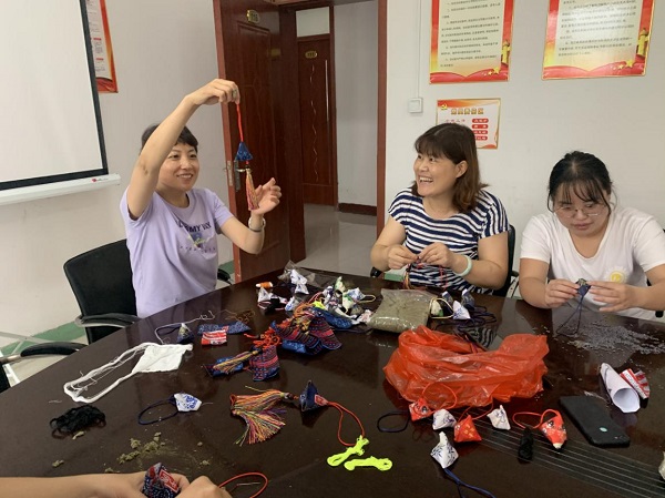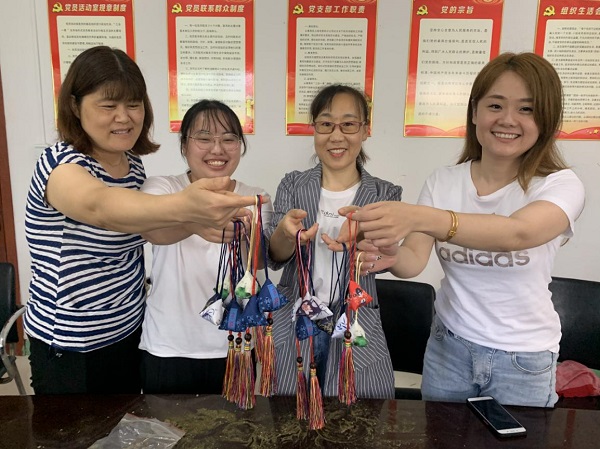 在傳統(tǒng)習俗中,玲瓏可愛的各色香包也是端午節(jié)必不可少的元素。包完粽子后大家轉(zhuǎn)移陣地到了活動室,大家圍坐桌邊,面前堆放著一份份材料包,有棉布、艾草、針線、中國結流蘇。面對這個從來沒有做過的DIY,大家開始研究起來,有的用手機搜索縫制方法流程,有的直接比來比去親自摸索著縫起來。有職工說:“這有點像咱們小時候老人們縫的毽子,那個里面裝的是五谷雜糧,咱們現(xiàn)在裝的是艾草。”“這香囊可以掛在辦公室或者車上,有清香、驅(qū)蚊的功效。”“我算是知道了,這個流蘇應該縫在這個邊的中間,而不是角上……”大家你一句我一句,手中的針線穿梭在棉布間,用密密的針腳縫制出傳統(tǒng)佳節(jié)最好的注解,用絲絲線線纏繞出端午安康的美滿寓意,一個個精巧可愛的三角香囊在大家的努力下完美呈現(xiàn)。