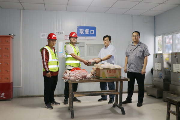 之后,劉志剛帶著月餅、豬肉等慰問品到作業班組生活區對一線工人進行慰問,在食堂劉志剛把豬肉遞到班組長手里并囑咐他們一定要提高節日期間的伙食水平,讓堅持在現場施工的工人吃好,消除他們的后顧之憂。