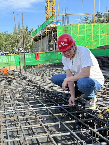 在搶抓進度的同時,史驚濤深知質量是項目的生命線。他帶領團隊狠抓質量控制,實現過程精品、一次成優,定期召開“質量分析會+作業面交底會”,嚴控每一個環節、精研每一道工序,尤其是在地下室施工鋼筋綁扎階段,鋼筋間距密、數量多,柱插筋、集水坑鋼筋要求位置精確,施工難度較大,他認真分析質量控制重點和難點,進行專項攻關,結合現場實際情況反復推敲施工方案,按照圖紙設計間距,在基礎墊層上彈好鋼筋位置線,綁扎時嚴格按照位置線進行柱插筋及集水坑鋼筋的放置及綁扎,墻筋采用水平和豎向定位筋,確保綁扎牢固,間距均勻,縱橫成線。
