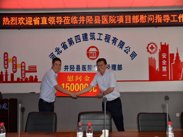 7月26日下午,河北省直工委副書記范金龍一行到二分公司井陘縣醫院項目部,對奮戰在一線的職工進行暑期慰問,為他們送來了慰問金和慰問品。集團工會主席王文利、公司黨委副書記、紀委書記、工會主席李懷生、二分公司黨總支書記孫立鋒一同參加。
