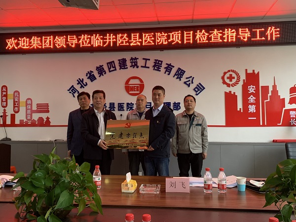 10月27日,集團黨委副書記張慶虎、黨委組織部部長張秋英、黨委組織部劉飛等一行三人到省四建二分公司井陘縣醫院項目黨支部進行黨建示范點驗收授牌。公司黨委副書記、紀委書記、工會主席李懷生,黨委組織部部長王彥森,分公司黨總支書記孫立鋒一同參加。