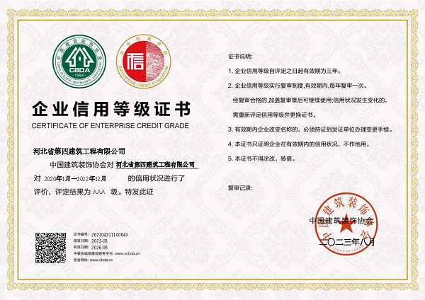 此次獲得中裝協(xié)AAA級企業(yè)信用等級證書,是中裝協(xié)對公司堅持守法經(jīng)營、誠信經(jīng)營的充分肯定和高度認可,是對河北四建實力和品牌形象的最好詮釋。(質量技術部)