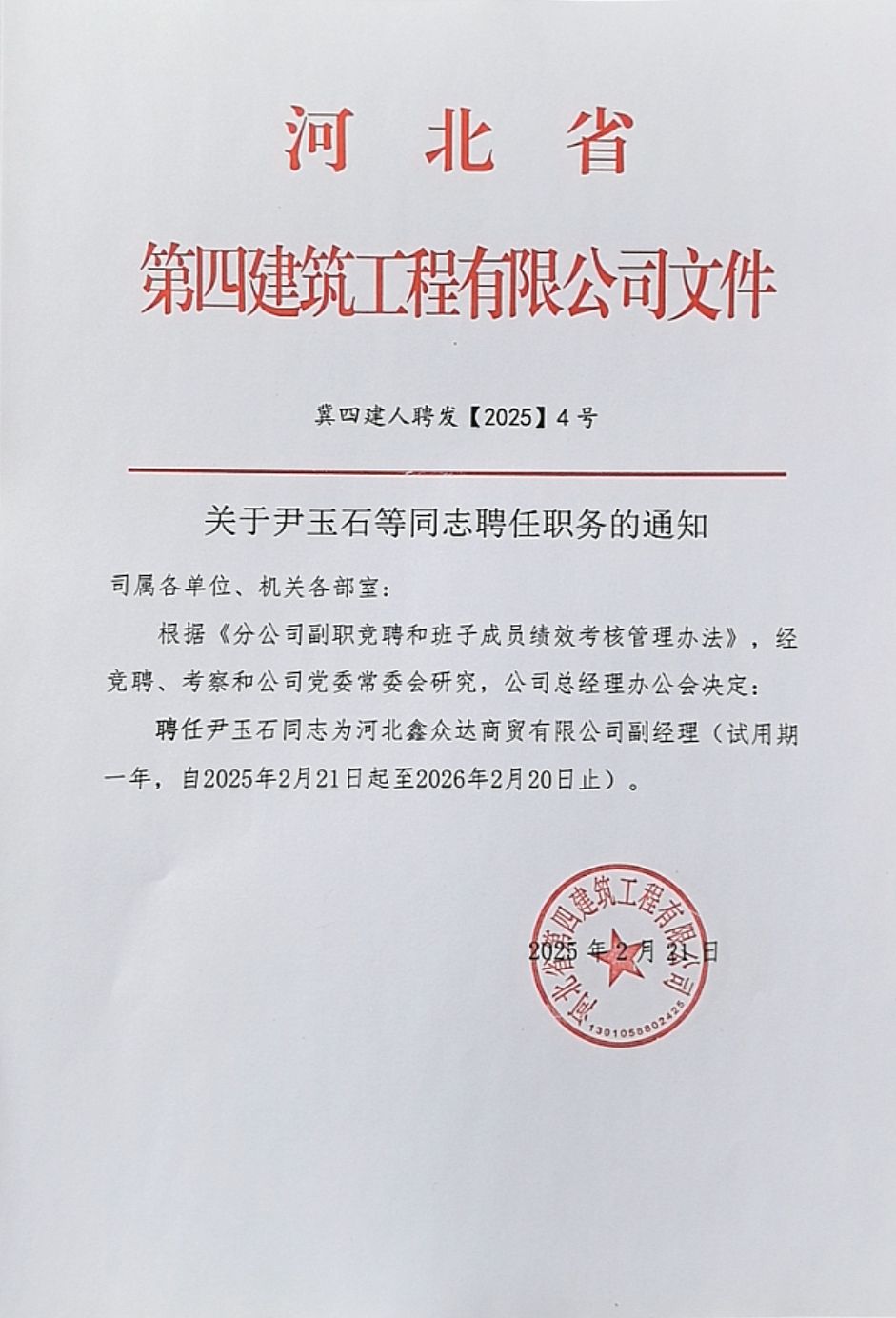 關于尹玉石同志聘任職務的通知